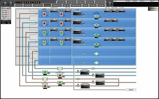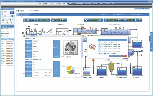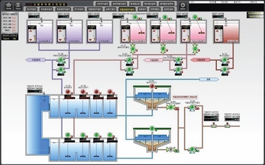 하수처리장의 시설물 및 계측데이터를 감시하고 시설물을 Auto 또는 Manual 모드로 조작이 가능합니다.수질 및 시설물진단